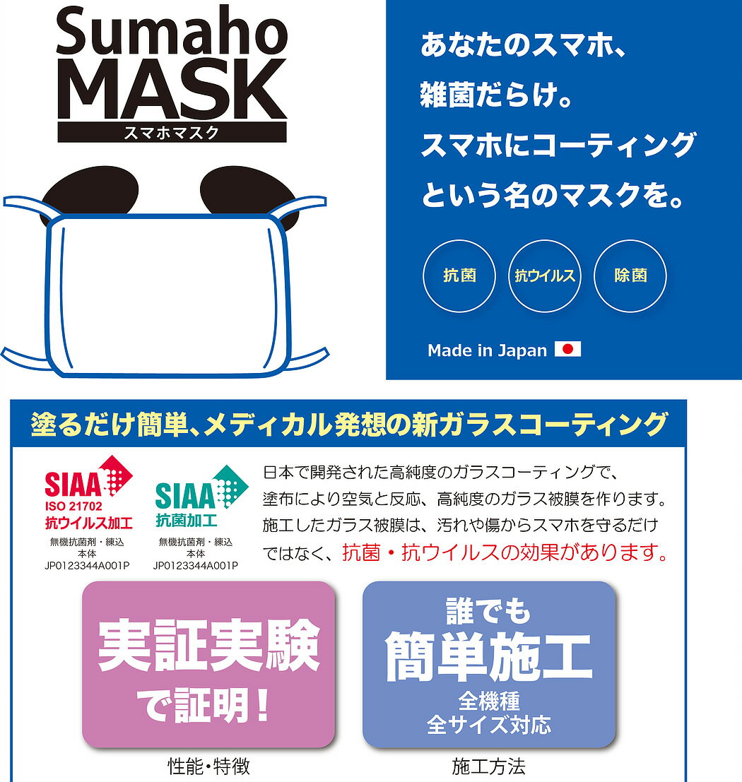 抗菌・抗ウイルス・除菌「Made in Japan」 仕様 「スマホマスク」でスマホやドアノブなどの感染媒体となるものをコーティングすることで、感染症の原因となり うる菌やウイルスの数を減少させます。